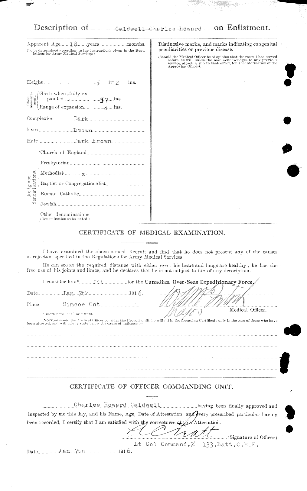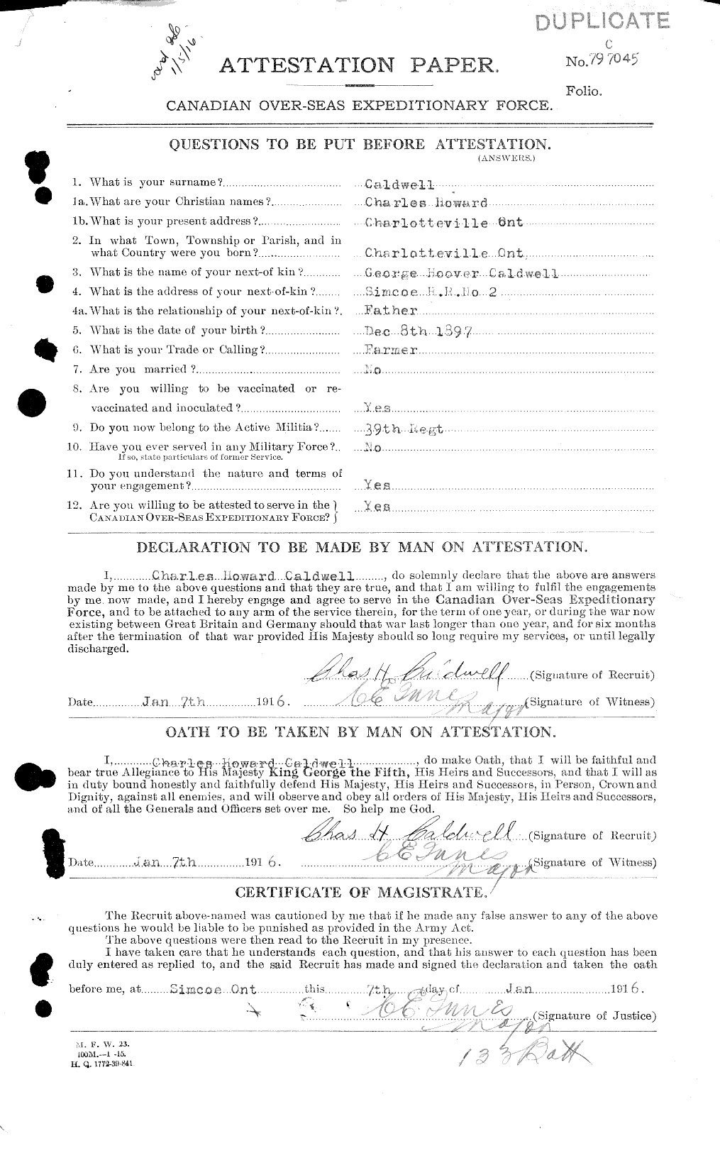 of RR2 Simcoe Caldwell -- Private C. H. Caldwell's letter home from France [SR19170719p5] -- Private Charles Howard Caldwell of Charlotteville is reported wounded [SR19170830p1] -- Pte. Charles Howard Caldwell (photo) of Charlotteville, wounded in action [SR19170906p5] -- Private C. H. Caldwell, reported wounded a couple of months ago, is now back on duty [SR191712p6p12] Caldwell -- Pte. Charles Howard Caldwell (photo) of Charlotteville, a member of the 133rd Battalion, is reported wounded in action for the second time. This time his injuries are from shrapnel in the arm and leg [SR19180822p6] Caldwell -- C. H. Caldwell and Miss Georgie were the guests of their sister, Mrs. P. Mater. A charivari party gathered at the home of Prosper Mater on Saturday evening to give Mr. and Mrs. C. H. Caldwell a welcome. Mrs. P. Mater, with her sister-in-law, who is spending a few years here, visited G. H. Caldwell, Thursday last [SR19191113p2] Caldwell -- Coville Caldwell of Chicago was a son of John N. Caldwell and Margaret Johnson of Forestville -- see Margaret's obituary Caldwell -- Miss Eva Maud
