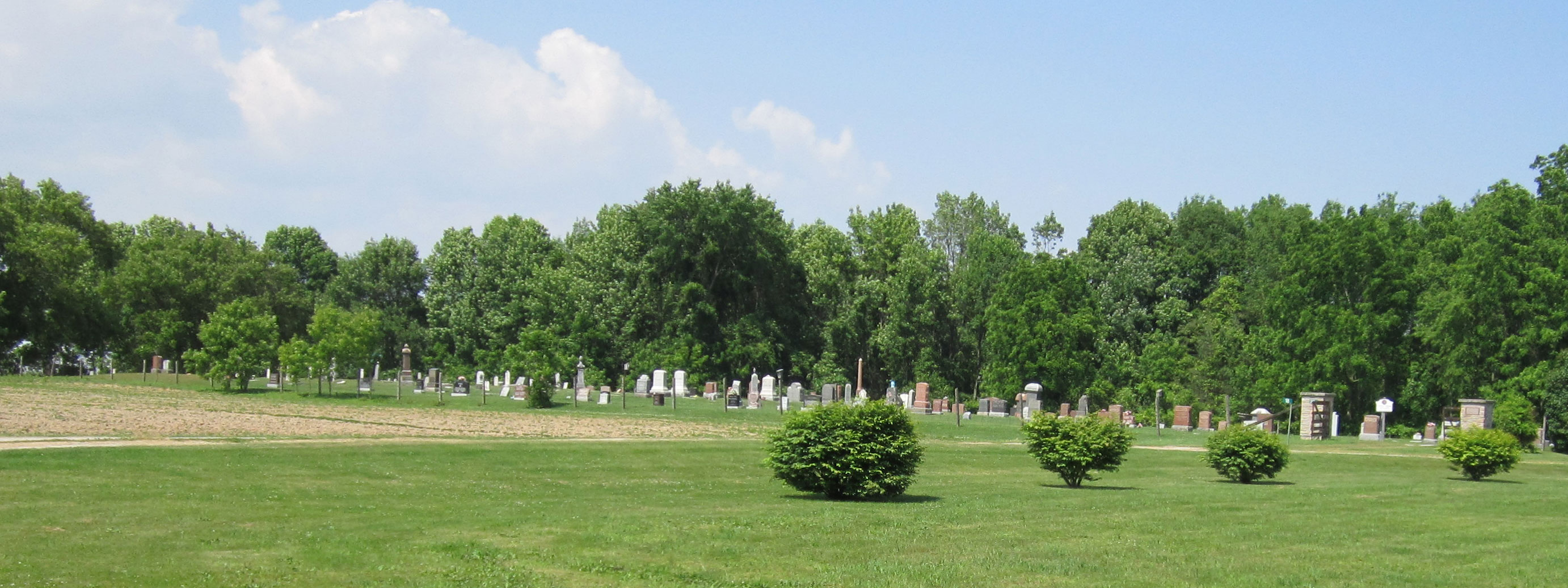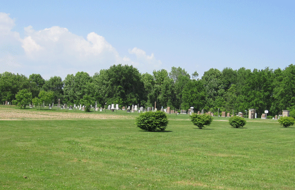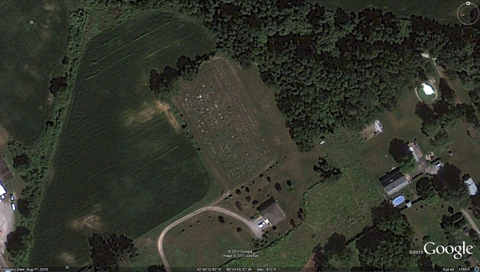 Township, Norfolk County, photographed 19 Jun 2011 by John Cardiff. -- see photo enlargement [Compiler's Comment: there are over 400 names on the surviving, readable stones in this cemetery, which is still in use.] -- also see: an aerial view screen capture of this cemetery from Google Earth. |