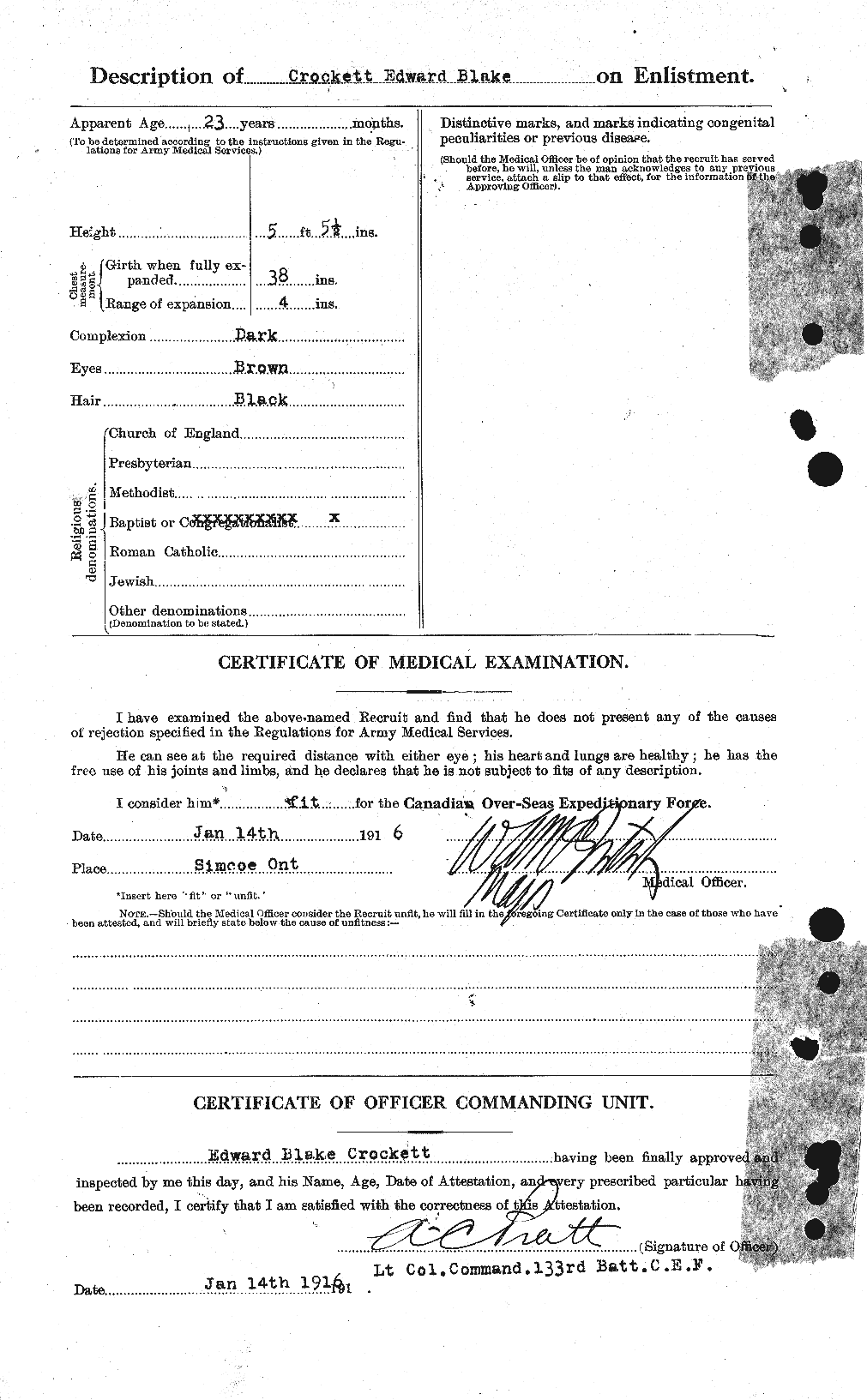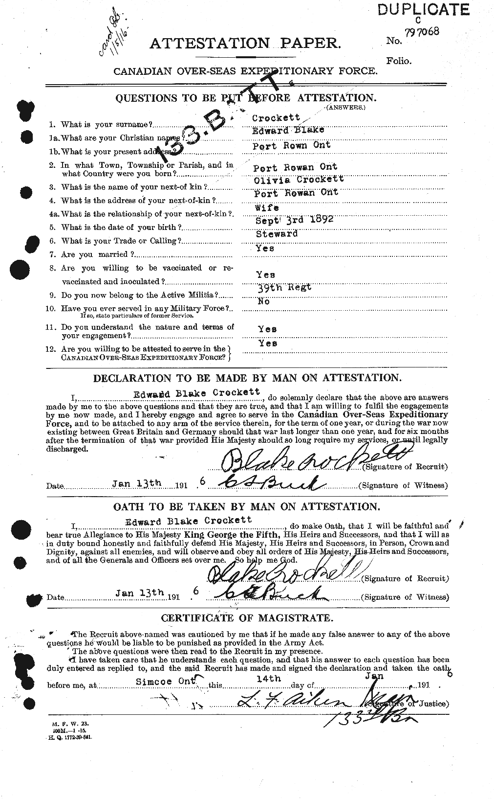 Crockett of Port Rowan, 23, Baptist, stewart, Crockett -- Private Blake Crockett has been on the casualty list for months and has been called to Toronto for re-examination [Port Rowan SR19170329p5] Crockett -- Blake Crockett will operate his pound net fishing business out of Port Dover. He will probably move there midsummer [SR19170426p2] Crockett -- to wife of Blake