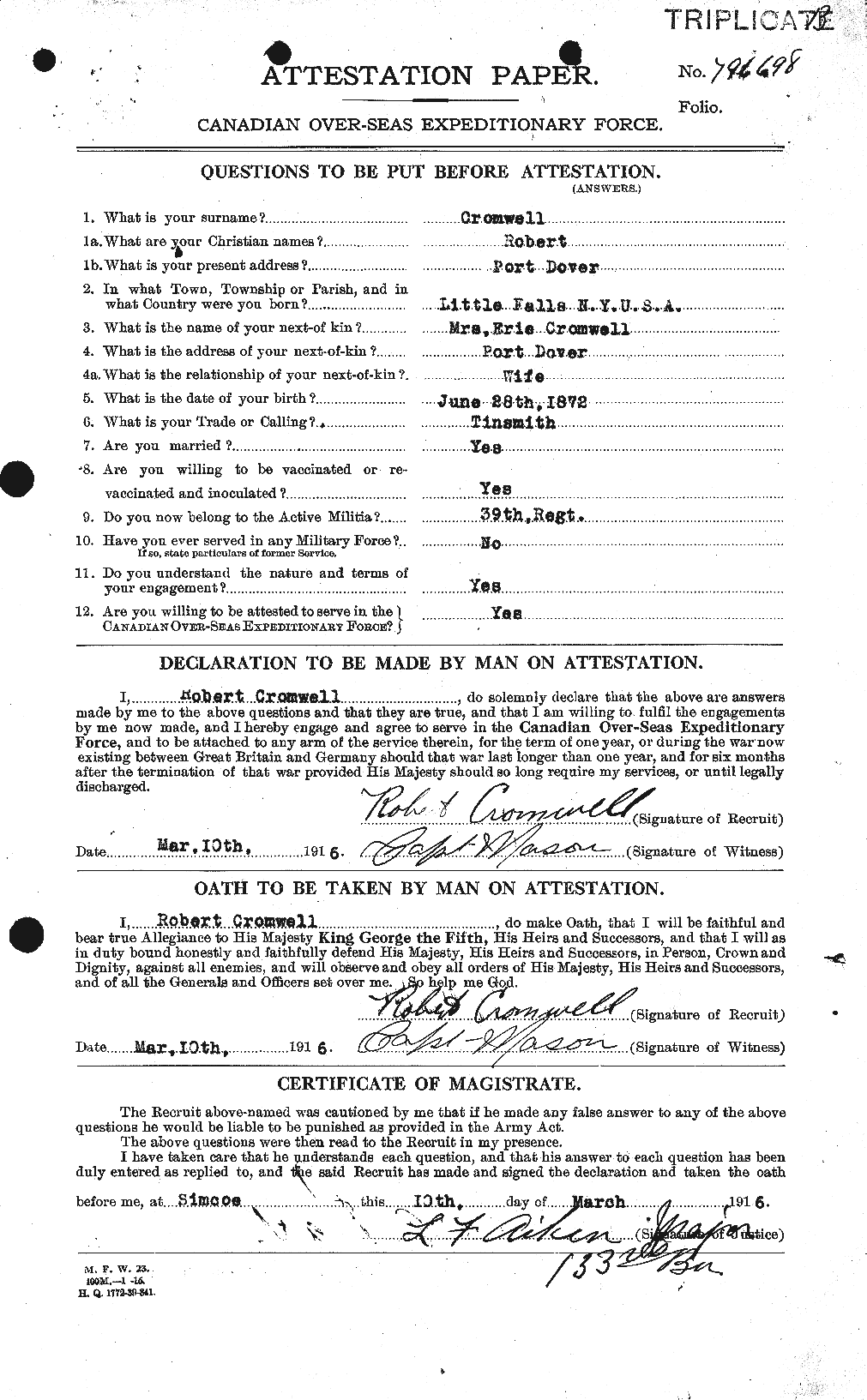 1872 in Little Falls N.Y., wife: Erie of Port Dover Cromwell -- Pte. R. J. Cromwell, who went overseas with the 133rd Battalion, has returned home from France [Port Dover SR19180425p2] Cromwell -- Robert
