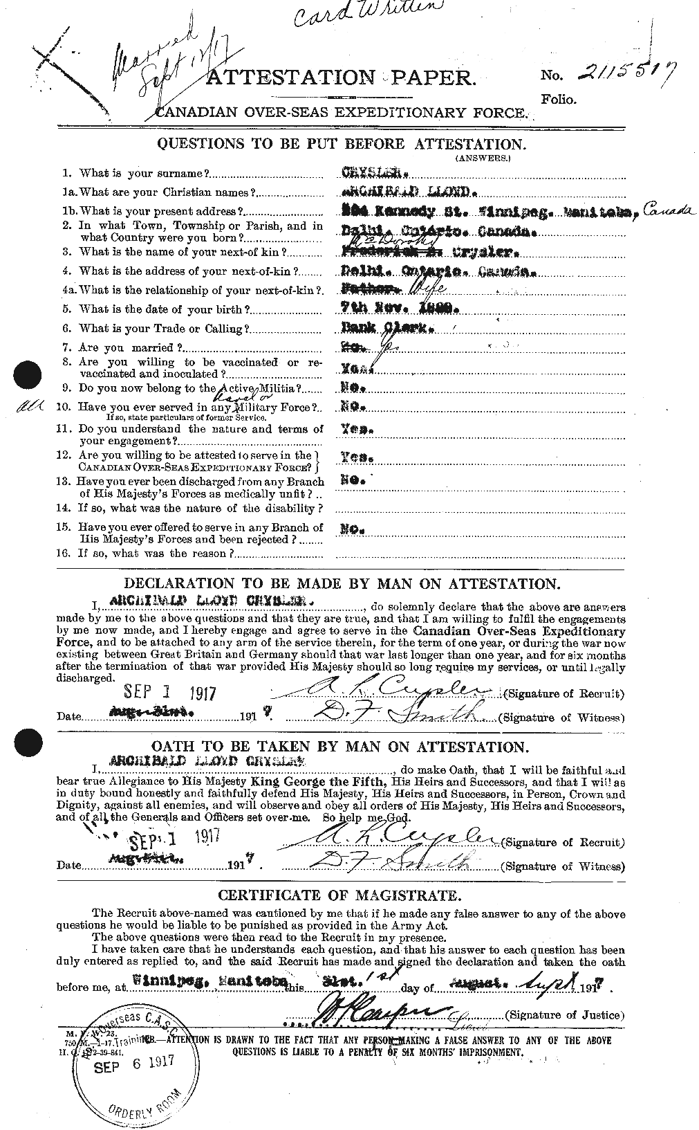 Crysler's widow, Sarah J. Ferguson, to mark 91st birthday Crysler -- Flight Lieut. Carlton [sic] Crysler of Delhi is on Simcoe on leave [SR19171108p12] Crysler -- Carleton Crysler