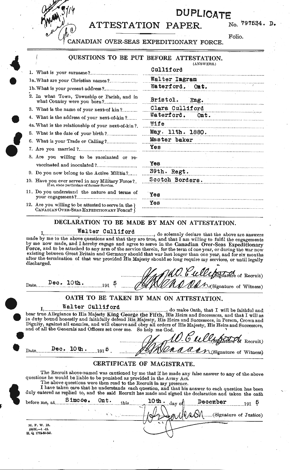 Culliford, 797534, Private [1916 Norfolk's Own] Culliford -- Mr. and Mrs. Walter I. Culliford of Waterford moved to Delhi on Saturday. He has bought a bakery there [SR19190403p9] Culliford -- Walter L. Culliford, baker, Main street, Delhi [1919 Voters List] Culliford -- to the wife of