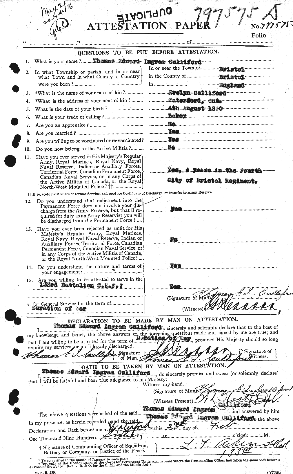 baker, born 4 Aug 1890 in Bristol England, son of Evelyn Culliford of