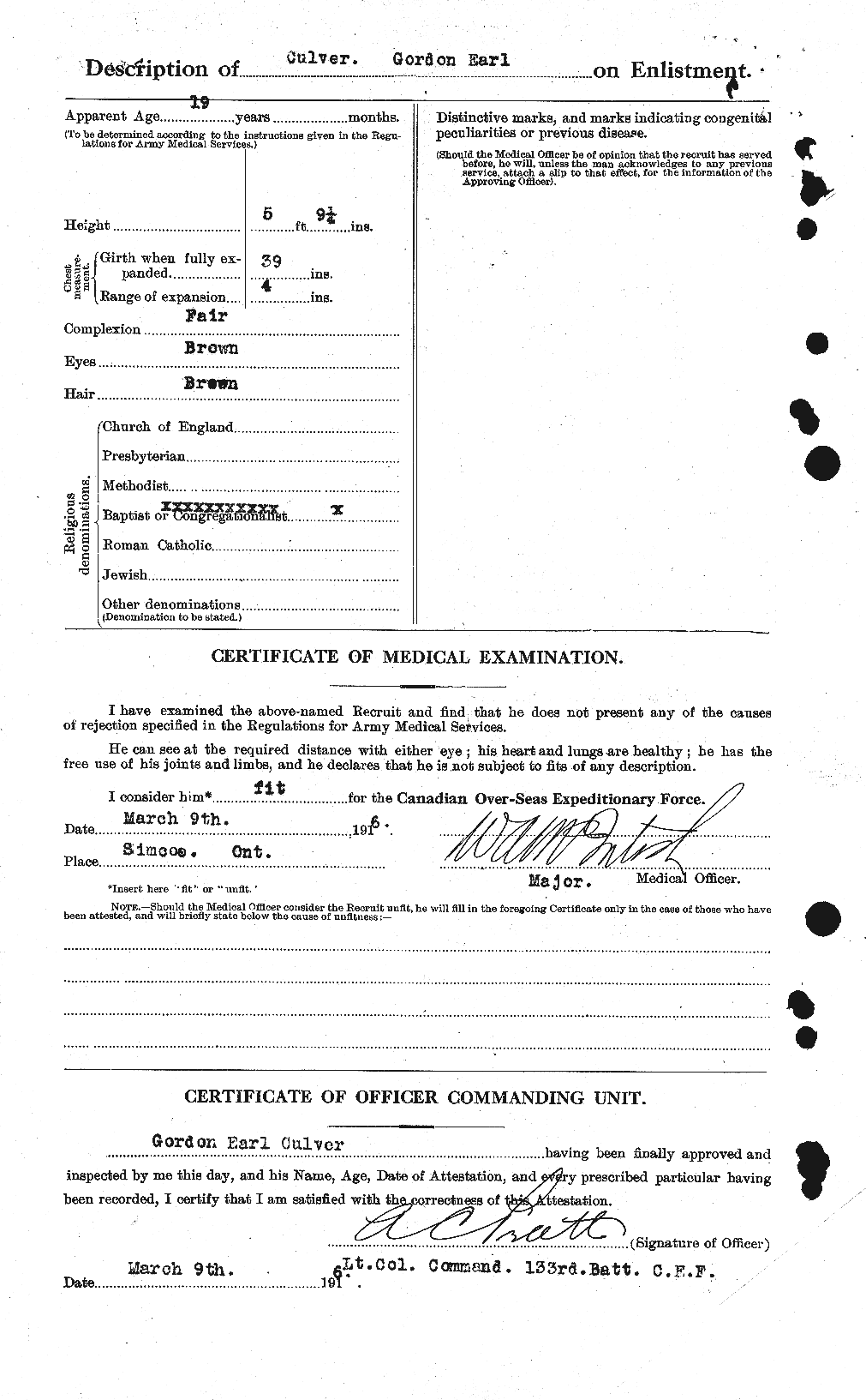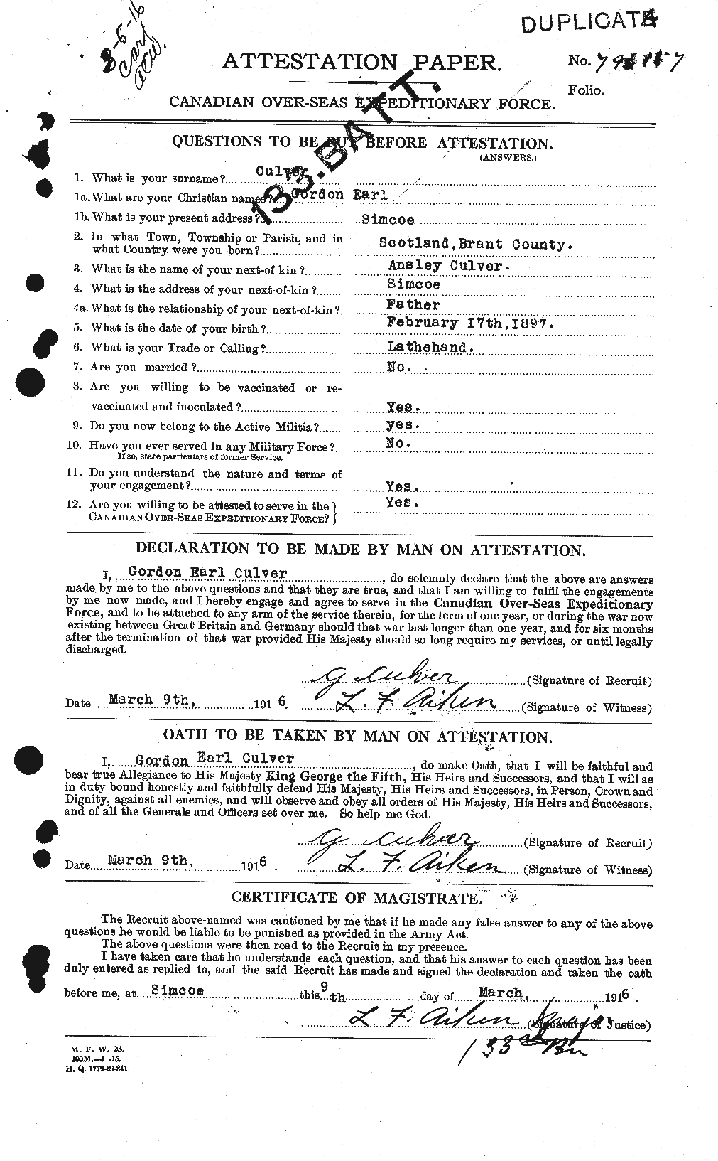 Scotland, Brant County, son of Ansley Culver of Simcoe. Attested 9