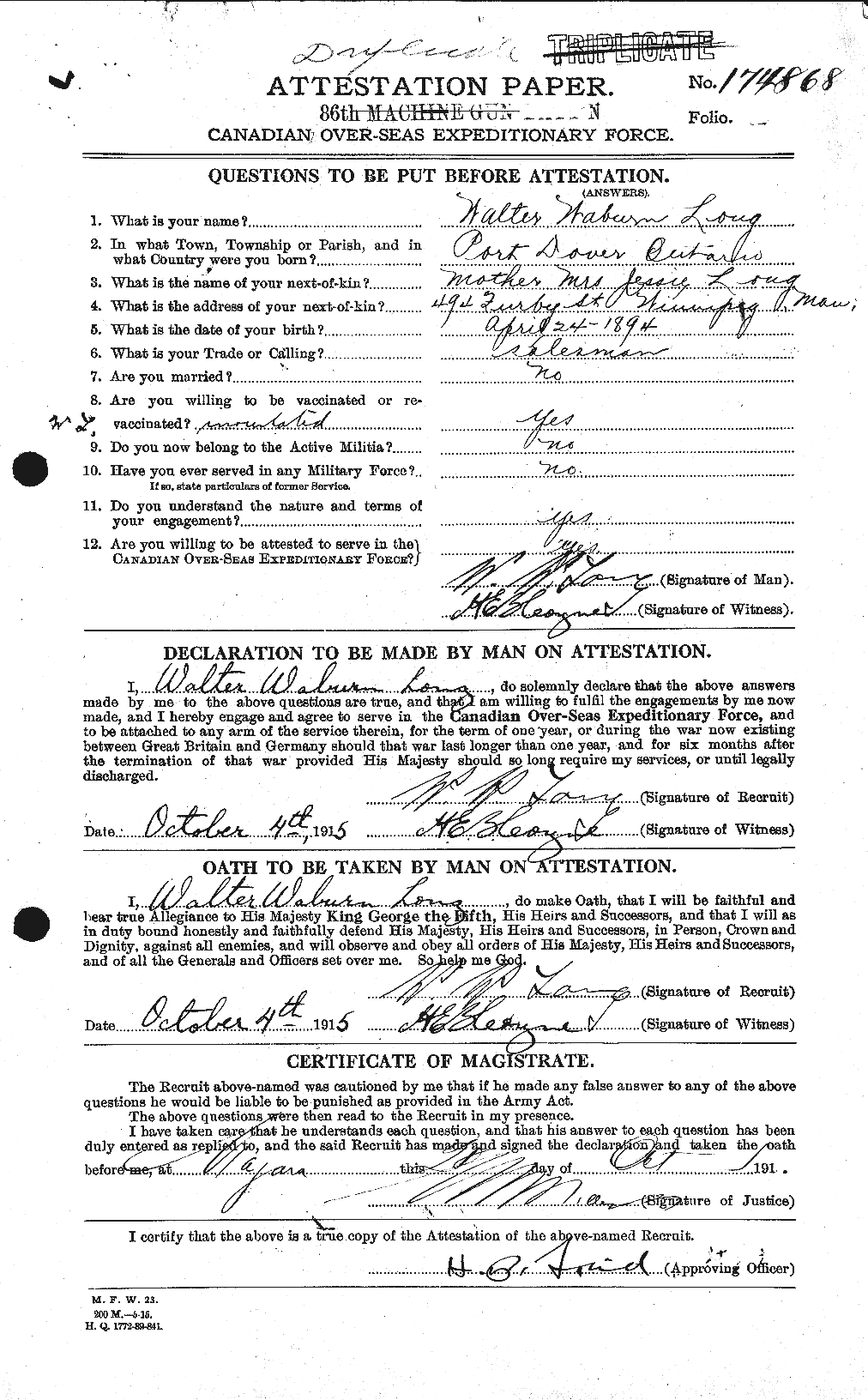Word has been received here that Walter Long, a former Port Dover boy, son of Mrs. H. Long, Paris, Ontario, has died of wounds.